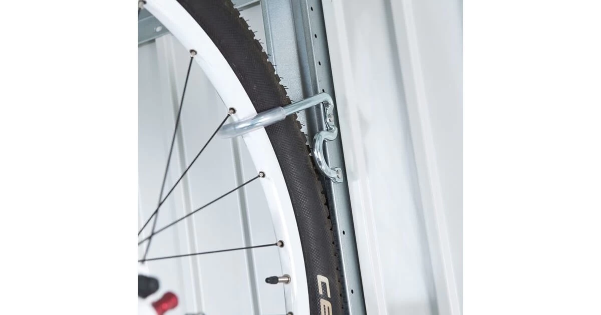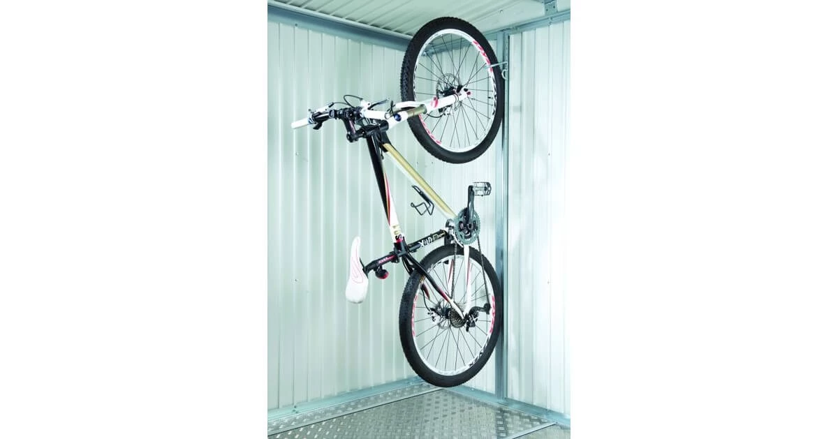 Mit der Fahrradaufhängung BikeMax können Sie Ihre Fahrräder bis zu einer Größe von 29-Zoll platzsparend in Ihrem Biohort Metall Gerätehaus aufbewahren. Der Aufhängehaken ist zudem 8-fach höhenverstellbar. Überdies ist eine Absperröse für Fahrradschlösser bereits integriert.