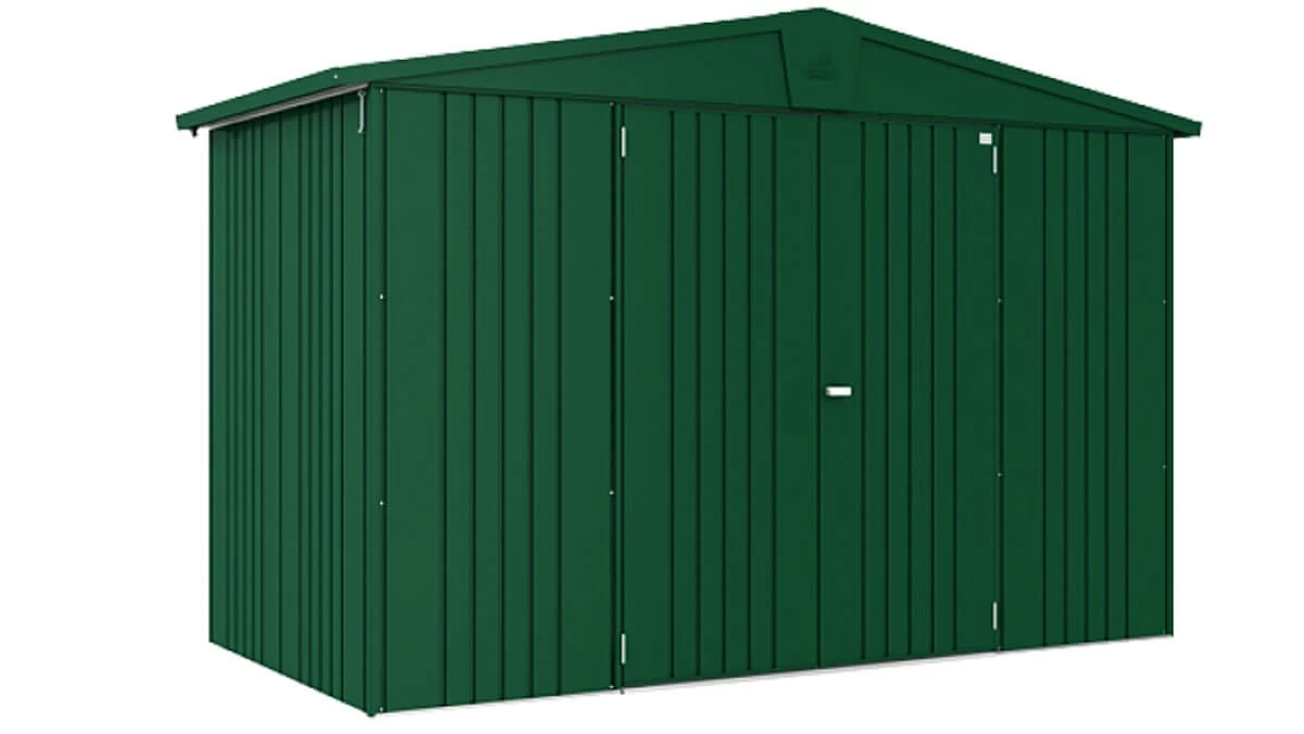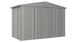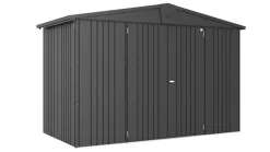 - Ausstattungsdetails: Drehgriff-Zylinderschloss, beidseitige Dachrinne, umfangreiche Grundausstattung (2 Regalsteher, 2 Regalböden, 4 Gerätehalter, Ordnungssystem an der Türinnenseite)