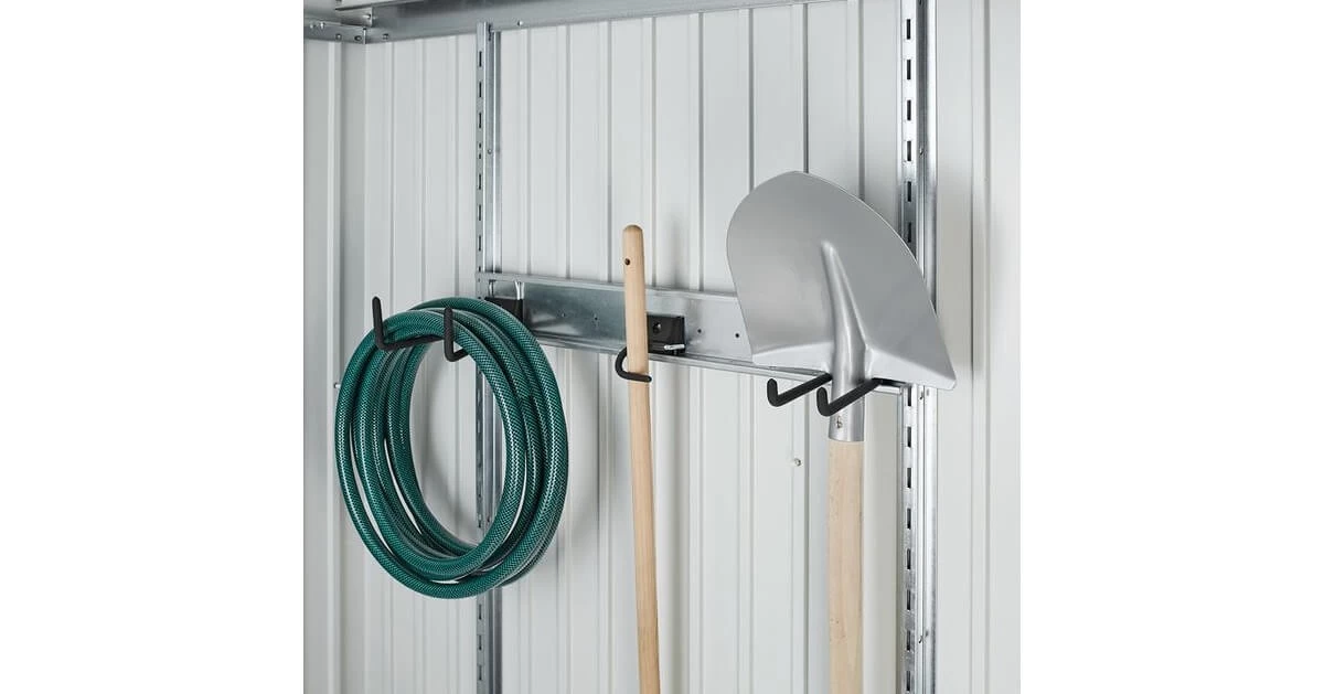 Set bestehend aus je einem Kombi-, Stiel- und Schaufelhaken und einer Wandschiene, die in 2 Regalsteher* eingehängt wird.