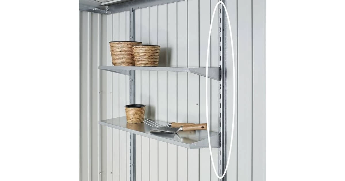 - Regalsteher aus Hut-Profil mit Schlitzen zum Einhängen der Regalböden, Einhängesack, Haken-Set oder Klapptisch