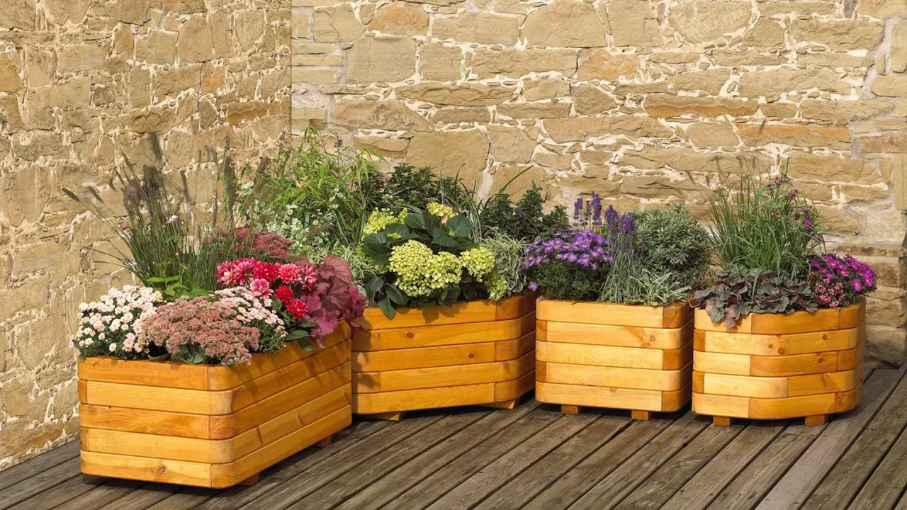 Aus gefastem Kantholz, farbig lasiert, mit stabiler Folie ausgeschlagen, ca. 35 cm hoch.