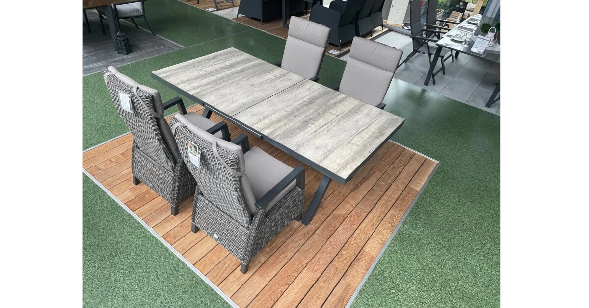 Freuen Sie sich auf gemeinsame Grillabende und gemütliches Beisammensein mit Ihren Lieben. Diese Tischgruppe macht es möglich und lädt Sie und Ihre Gäste jederzeit zum Zurücklehnen und Verweilen ein. Das wetterfeste und pflegeleichte Dining-Set bietet bequem bis zu 4 Personen Platz. Sie erhalten den Ausziehtisch Montana mit rechteckiger Tischplatte und 4 bequeme Dining Sessel Corido. Stellen Sie die Rückenlehne des Anpassungskünstlers ganz einfach über einen Knopf in der Armlehne stufenlos ein. Die verbesserte Movetechnik sorgt für eine sanft laufende Rückenlehne, die müheloses Entspannen ermöglicht. Jeder Sessel hat ein Gesamtmaß von ca. 76 x 62 x 109 cm. Die ca. 50 cm breite Sitzfläche ist großzügig bemessen und bietet ein tolles Sitzgefühl. Mit einer Sitztiefe von ca. 48 cm und bei einer Sitzhöhe von ca. 44 cm lässt es sich hier auch herrlich bei einem Nickerchen entschleunigen. Die praktischen Armlehnen aus Aluminium in einer Höhe von ca. 64 cm bieten zusätzlichen Komfort. Passende Sitzpolster in der Trendfarbe taupe meliert verleihen den Sitzmöbeln ein unvergleichliches Sitzerlebnis.