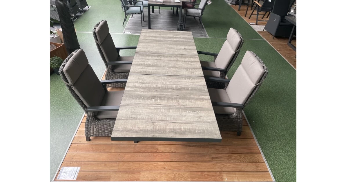 Der stylische Automatik-Ausziehtisch Montana ist ein wahrer VerwandlungskĂĽnstler. Er hat eine Größe von ca. 200 x 100 x 77 cm und die Unterschubhöhe beträgt ca. 66 cm. Dank einem Gewicht von ca. 93,5 kg hält er auch jeglichen Windstößen perfekt stand. Sein ausgefallenes X-Gestell aus Aluminium in schwarz und die moderne Keramik-Tischplatte in naturgrauer Holzoptik unterstreichen den modernen, natĂĽrlichen Look und verleihen dem Tisch einen eleganten Charakter. Die Platte ist robust, pflegeleicht und dazu noch wetterfest – ideal fĂĽr die Nutzung im AuĂźen- und Innenbereich. Der Clou: bei spontanen Gästen sind Sie perfekt vorbereitet. Der Tisch lässt sich dank der Automatikfunktion ganz einfach auf ca. 260 cm Länge ausziehen.