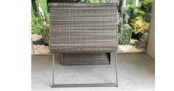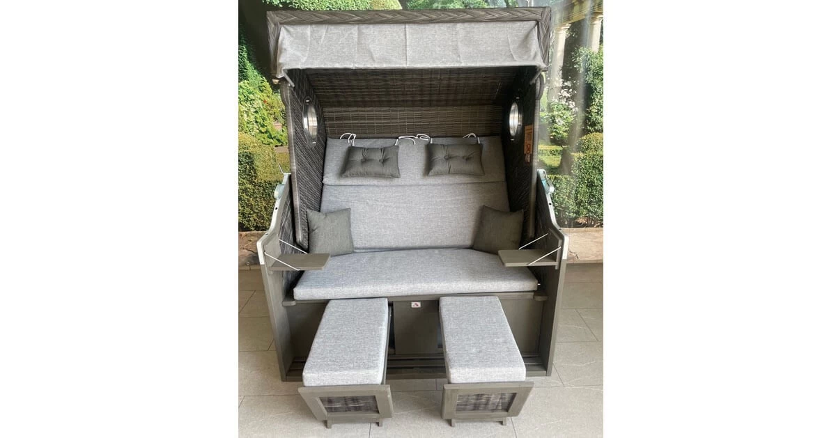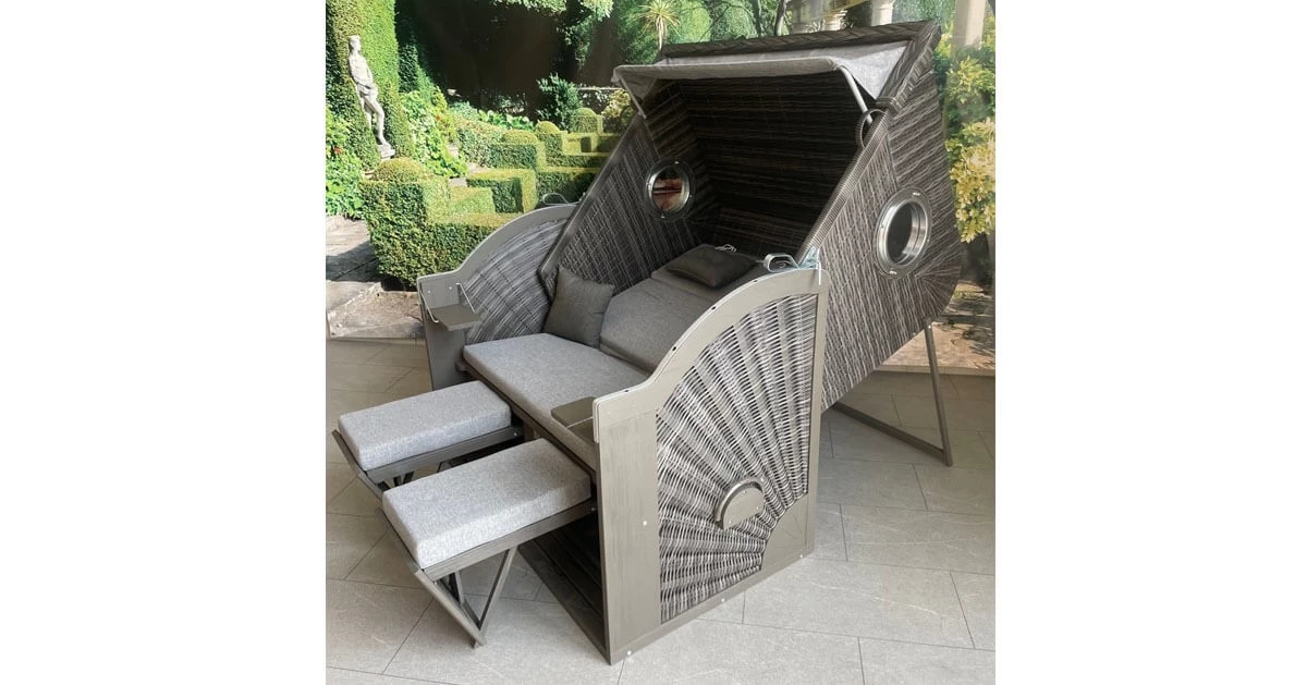 Für den Kurzurlaub zu Hause: Dieser Strandkorb mit einem Oberkorb aus grau lasiertem Hartholz und einem farblich passenden Geflecht in Rattanoptik ist eine Bereicherung für jeden Garten oder ihre Terrasse. Dank des klappbaren Oberkorbs bietet der Strandkorb verschiedene Sitz- und Liegemöglichkeiten, Fußstützen sowie zwei Nacken-, Fuß- und zwei Zierkissen sorgen für herrliche Gemütlichkeit. Die beiden klappbaren Tische an der Seite sind der ideale Abstellplatz für ihren wohlverdienten Urlaubs-Cocktail. Zwei Bullaugen sorgen für das maritime Flair.
