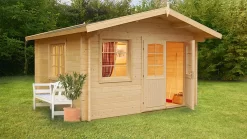 Das solide Blockbohlenhaus mit einer Grundfläche von 13 m² bietet Ihnen viel Stauraum um Ihre Gartengeräte und Werkzeuge geordnet und witterungsgeschützt zu verstauen. Durch die Wandbohlenstärke von 70 mm und die Isolierverglasungen kann das Gartenhaus selbst im Winter genutzt werden. Als Blickfang empfängt Sie einladend die Hausfront mit der Doppeltür mit dem Einzelfenster. An der Seitenfront befindet sich das breite Doppelfenster. Die isolierverglasten Fenster und die isolierverglaste Doppeltür schenken dem Innenraum viel Licht und verschaffen ihm eine gemütliche Wohlfühlatmosphäre.