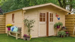 Das moderne Blockbohlenhaus mit einer Wandbohlenstärke von 40 mm bietet Ihnen auf einer Grundfläche von 14,44 m² ausreichend Stauraum.