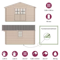 Das moderne Blockbohlenhaus mit einer Wandbohlenstärke von 40 mm bietet Ihnen auf einer Grundfläche von 14,44 m² ausreichend Stauraum.