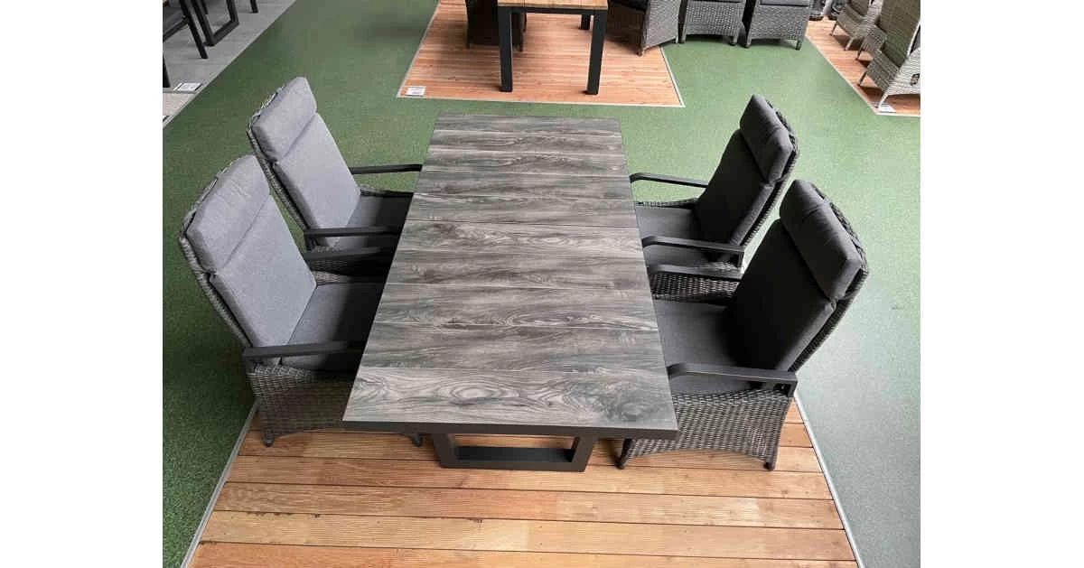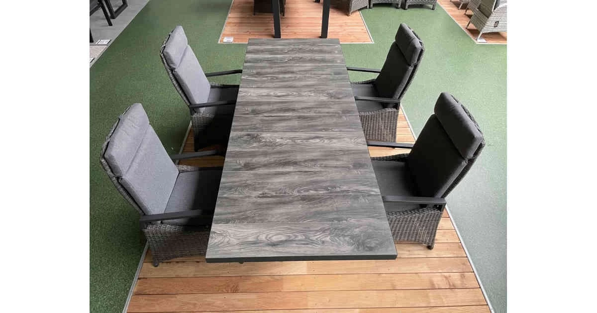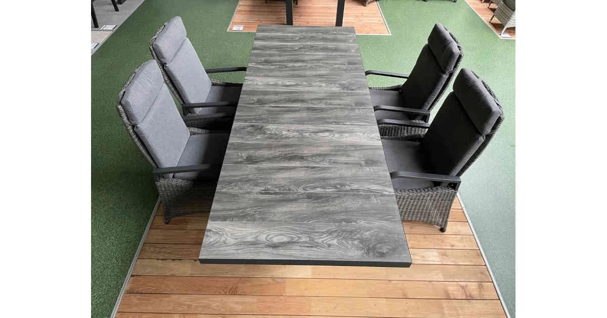 Unsere Luxus-Essgruppe aus der neuen Möbelserie Keramo überzeugt durch Funktionaltät und ansprechendem Design. Die konsequente Weiterentwicklung der Serie Barcelona, nun mit eleganten Armlehnen aus Aluminium. Begeistern Sie sich und Ihre Gäste mit dieser neu entwickelten Gartensitzgruppe »Keramo« Dining. Dank stufenlos verstellbarer Rückenlehne und kombiniertem Sitz- und Rückenpolster bieten Ihnen die Gartenstühle jederzeit ein optimales Sitzkomfort. Der Keramiktsch bietet Platz für bis zu 8 Personen. Dank der ausziehbaren Verstellung kann der Gartentisch problemlos von 200cm auf 260cm ausgezogen werden. Die Tischplatte des Keramo Esstisches besteht aus grauen Keramikplatten in Holzoptik, welche extrem kratz- und stoßfest sind. Die Kombination aus dem anthrazitfarbenen Rahmen, dem grau-melierten Polyrattangeflecht und der passenden Auflage wird Ihre Terrasse oder den Wintergarten optisch bereichern. Gönnen Sie sich den Luxus von hochwertigen und langlebigen Möbeln für den Außenbereich.