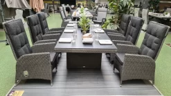 Unsere Luxus-Essgruppe aus der beliebten Möbelserie Rocking überzeugt nicht nur durch ein ansprechendes Design. Dank 200 x 100 cm großer Tischplatte bietet Ihnen der mit Polyrattan-Geflecht bezogene Wangentisch aus Aluminium ausreichend Platz für bis zu acht Personen. Die Platte des Tisches besteht aus Glas, welches mit einer Keramikschicht überzogen und anschließend versiegelt worden ist.