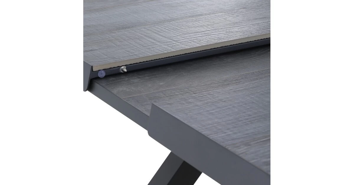 Wer das Besondere liebt und gerne auf jede Gelegenheit vorbereitet sein möchte, ist mit diesem ausziehbaren Automatik-Esstisch bestens bedient. Der Tisch ist ca. 90 cm breit und ca. 77 cm hoch, im normalen Zustand hat er eine Länge von ca. 160 cm – so steht dem gemĂĽtlichen Mittagessen mit der Familie nichts mehr im Wege. Das Gestell wurde aus pulverbeschichtetem Aluminium in Anthrazit hergestellt, was den Tisch besonders haltbar macht. Die Tischplatte besteht aus hochwertigem Keramik in graubrauner Holzoptik. Die Platte zum Erweitern des Tisches ist ebenfalls aus Keramik gefertigt und lässt sich ganz einfach ausziehen. Man zieht einfach die beiden oberen Platten auseinander und die darunterliegende Keramikplatte schwenkt aufgrund der Automatikfunktion nach oben, und schon ist der Tisch auf ca. 200 cm erweitert – perfekt fĂĽr spontane, groĂźe Runden. Die Unterschubhöhe beträgt ca. 68 cm – so kann man gemĂĽtlich mit vielen Arten von Sesseln an diesem Tisch Platz nehmen. Der Tisch hat ein Gewicht von ca. 93,5 kg, und ist somit perfekt gegen Windstöße geschĂĽtzt. Die FuĂźkappen bestehen aus schwarzem Kunststoff und schĂĽtzen den Boden vor unschönen Kratzern beim VerrĂĽcken des MöbelstĂĽcks.