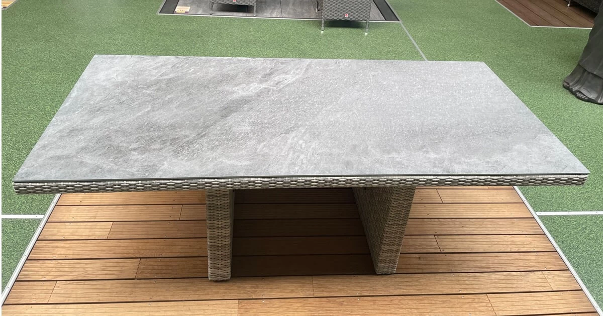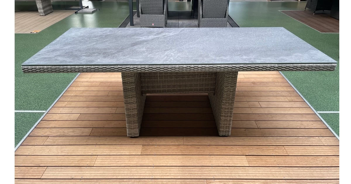 - Gartentisch mit 200 x 100 cm Spraystone-Tischplatte im beliebten Wangentisch-Design.