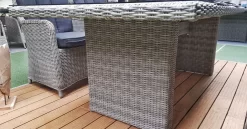 Der Geflechttisch Durban in den MaĂźen 220 x 100 cm bietet viel Platz. Das Grundgestell ist aus pulverbeschichtetem Aluminium und hat ein Kunststoffgeflecht in Rattanoptik in der Farbe steingrau. Der Geflechttisch besitzt eine Glasplatte.