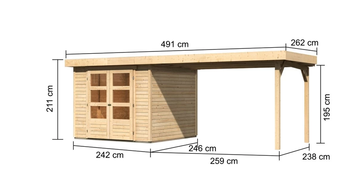 Mit einem Außenmaß von(BxT) 242x246cm besitzt es die ideale Größe, um Gartengeräte zu verstauen oder einen gemütlichen Rückzugsort zu schaffen. Das Gartenhaus ist optional mit einem Anbaudach in den Breiten 2,40m oder 2,80m erhältlich, welches zusätzlichen Raum bietet. Der neu gewonnene Platz eignet sich ideal als Unterstand für große Gartengeräte oder für eine bequeme Sitzgruppe im Freien. So können Sie Ihren Garten nicht nur bei Sonnenschein in vollen Zügen genießen.