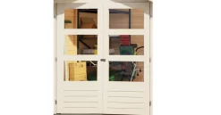 Das Innere des Gartenhauses wird durch eine Sicherheitsüberfalle vor unbefugtem Eindringen geschützt. Die großzügige Doppelflügeltür mit drei Lichtausschnitten pro Türflügel sorgt für viel Lichteinfall, sodass das Haus nicht nur von außen strahlen kann. Durch seine moderne Optik wird das Gartenhaus Askola zu einem echten Hingucker in Ihrem Garten. Setzen Sie einen Akzent in Ihrem Garten mit dem Askola 3.