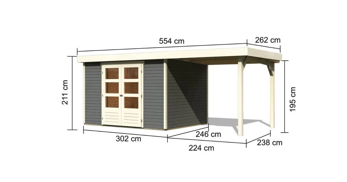 Mit einem Außenmaß von(BxT) 302x246cm besitzt es die ideale Größe, um Gartengeräte zu verstauen oder einen gemütlichen Rückzugsort zu schaffen. Das Gartenhaus ist optional mit einem Anbaudach in den Breiten 2,40m oder 2,80m erhältlich, welches zusätzlichen Raum bietet. Der neu gewonnene Platz eignet sich ideal als Unterstand für große Gartengeräte oder für eine bequeme Sitzgruppe im Freien. So können Sie Ihren Garten nicht nur bei Sonnenschein in vollen Zügen genießen.