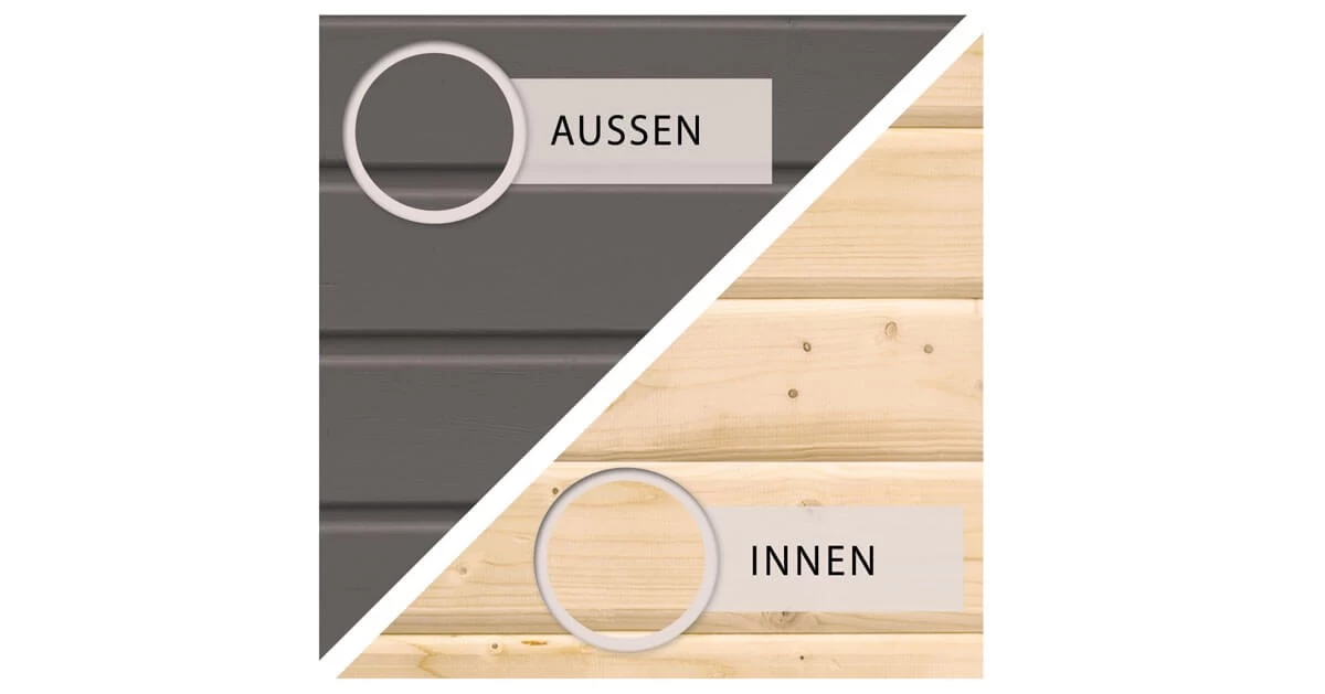 Hinweis: Die Wandinnenseiten, das Dach, der Boden und die Schnittkanten sind aus produktionstechnischen Gründen nicht endbehandelt und stellen somit einen Unterschied zur Außenseite dar. (Diese müssen nachbehandelt werden)