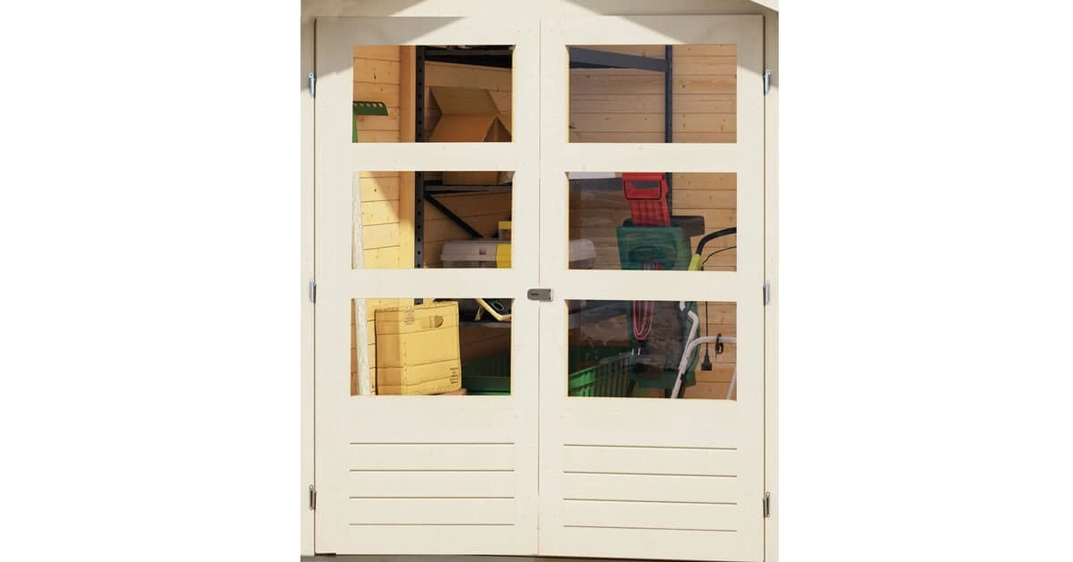 Durch das naturbelassene Holz lässt sich das Gartenhaus Askola ganz nach Ihren Wünschen und Vorstellungen gestalten. Eine großzügige Doppelflügeltür mit drei Lichtausschnitten pro Türflügel lässt Sie in das Innere des Hauses. Dieses wird durch eine Sicherheitsüberfalle vor unbefugtem Betreten geschützt.