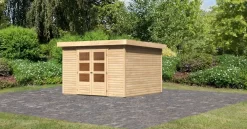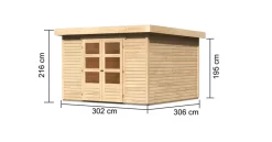 Mit einem Außenmaß von(BxT) 302x306cm besitzt es die ideale Größe, um Gartengeräte zu verstauen oder einen gemütlichen Rückzugsort zu schaffen. Das Gartenhaus ist optional mit einem Anbaudach in den Breiten 2,40m oder 2,80m erhältlich, welches zusätzlichen Raum bietet. Der neu gewonnene Platz eignet sich ideal als Unterstand für große Gartengeräte oder für eine bequeme Sitzgruppe im Freien. So können Sie Ihren Garten nicht nur bei Sonnenschein in vollen Zügen genießen.