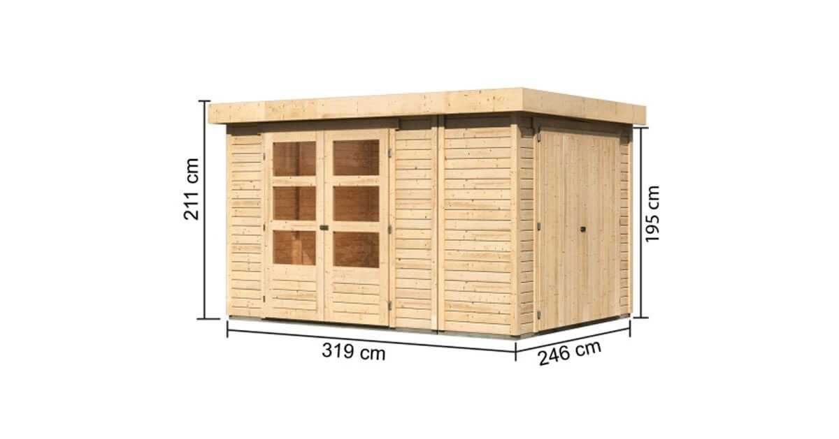 Das Flachdach verleiht dem Haus seinen modernen Look. Das Besondere am Gartenhaus Retola 4: der integrierte Anbauschrank an der Seite des Hauses. Dieser bietet mit den Maßen (BxT) 77 x 246 cm ausreichend Platz für Ihre Gartengeräte. Somit haben Sie die Möglichkeit das Gartenhaus gleich doppelt zu nutzen. Während Sie im Anbauschrank Ihre Geräte verstauen, können Sie sich nach getaner Arbeit ins gemütlich eingerichtete Gartenhaus zurückziehen.