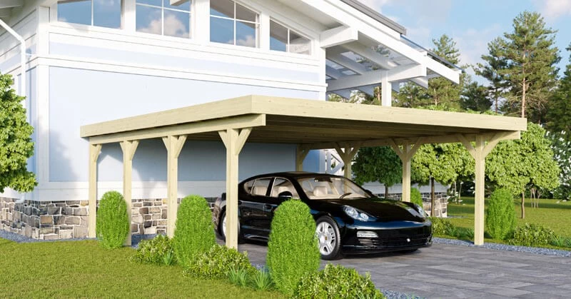 Das Doppelcarport Classic überzeugt durch seine stabile Konstruktion. Das Flachdach besteht wahlweise aus 0,8mm starken PVC-Trapezplatten oder aus 0,5mm starken Stahldachplatten. Beide Dachvarianten werden mit einer Walmdachblende aus Massivholz geliefert, welche die unschönen Kanten der Dachplatten abdeckt. Getragen wir die Konstruktion durch 11,5×11,5 cm starke Pfosten inkl. Querverbindern aus kesseldruckimprägniertem Massivholz. Optional können Sie Ihr Carport durch ein oder zwei Einfahrtsbögen ergänzen und es so optisch aufwerten. Durch optional erhältliche H-Pfostenanker werden die Massivholzpfosten mit dem Boden sicher verbunden. Gestalten Sie Ihr Carport nach Ihren Wünschen. Durch eine zusätzlich erhältliche Seiten- oder Rückwand können Sie Ihre Autos abschirmen und so noch effektiver von der Seite vor Schlagregen schützen. Benötigen Sie zusätzlichen Stauraum? Auch das ist mit dem Doppelcarport Classic kein Problem. Mit einem Geräteraum in zwei unterschiedlichen Modellen schaffen Sie in Ihrem Carport zusätzlichen Platz. Hier können Sie Ihre Gartengeräte, Fahrräder oder Ihre Gartenmöbel den Winter über verstauen. Mit einem Gesamtaußenmaß von 563 x 586 cm bietet das Doppelcarport Classic genügend Platz für zwei Autos. Schaffen Sie einen geschützten Ort für Ihre PKWs mit dem Doppelcarport Classic.