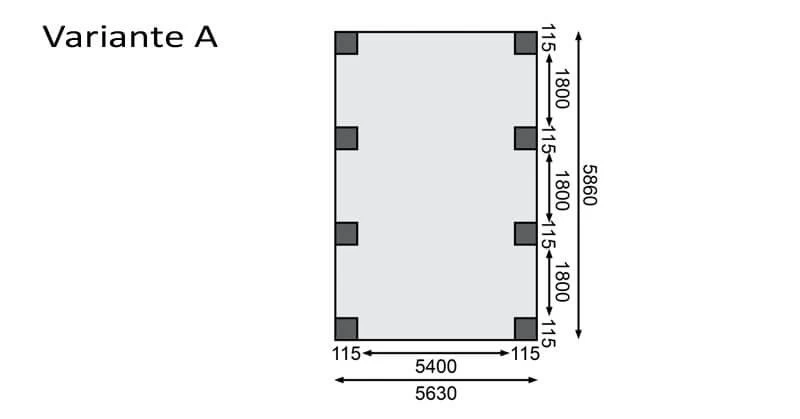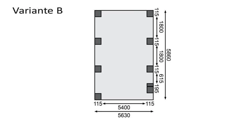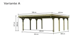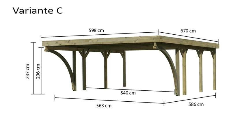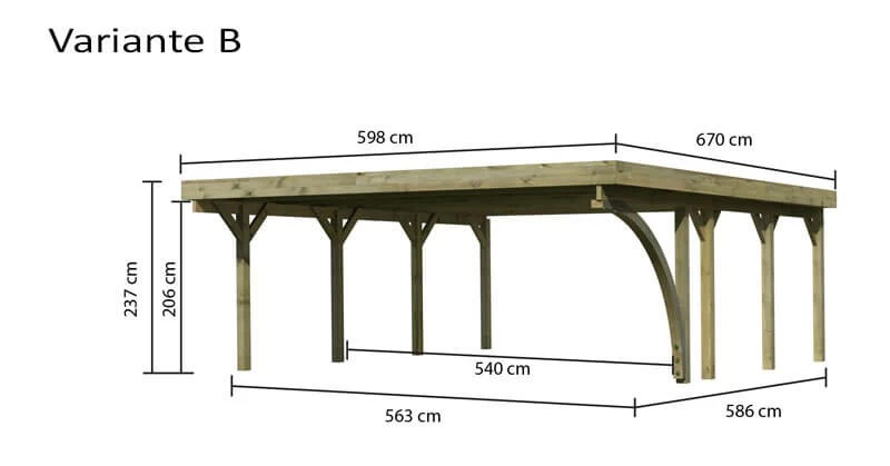 Das Doppelcarport Classic überzeugt durch seine stabile Konstruktion. Das Flachdach besteht wahlweise aus 0,8mm starken PVC-Trapezplatten oder aus 0,5mm starken Stahldachplatten. Beide Dachvarianten werden mit einer Walmdachblende aus Massivholz geliefert, welche die unschönen Kanten der Dachplatten abdeckt. Getragen wir die Konstruktion durch 11,5×11,5 cm starke Pfosten inkl. Querverbindern aus kesseldruckimprägniertem Massivholz. Optional können Sie Ihr Carport durch ein oder zwei Einfahrtsbögen ergänzen und es so optisch aufwerten. Durch optional erhältliche H-Pfostenanker werden die Massivholzpfosten mit dem Boden sicher verbunden. Gestalten Sie Ihr Carport nach Ihren Wünschen. Durch eine zusätzlich erhältliche Seiten- oder Rückwand können Sie Ihre Autos abschirmen und so noch effektiver von der Seite vor Schlagregen schützen. Benötigen Sie zusätzlichen Stauraum? Auch das ist mit dem Doppelcarport Classic kein Problem. Mit einem Geräteraum in zwei unterschiedlichen Modellen schaffen Sie in Ihrem Carport zusätzlichen Platz. Hier können Sie Ihre Gartengeräte, Fahrräder oder Ihre Gartenmöbel den Winter über verstauen. Mit einem Gesamtaußenmaß von 563 x 586 cm bietet das Doppelcarport Classic genügend Platz für zwei Autos. Schaffen Sie einen geschützten Ort für Ihre PKWs mit dem Doppelcarport Classic.