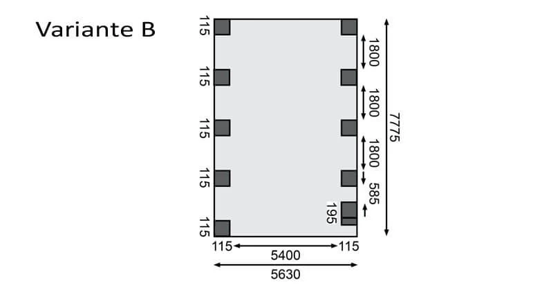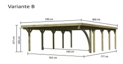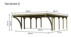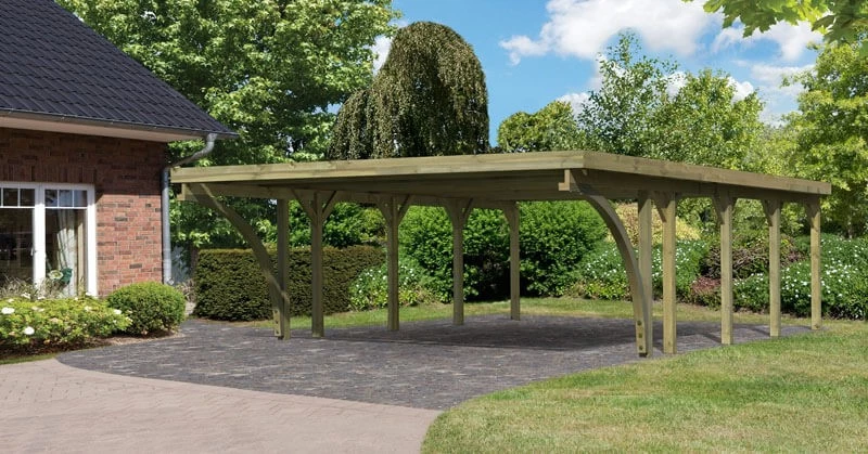 Das Doppelcarport Classic ĂĽberzeugt durch seine stabile Konstruktion. Das Flachdach besteht wahlweise aus 0,8mm starken PVC-Trapezplatten oder aus 0,5mm starken Stahldachplatten. Beide Dachvarianten werden mit einer Walmdachblende aus Massivholz geliefert, welche die unschönen Kanten der Dachplatten abdeckt. Getragen wir die Konstruktion durch 11,5×11,5 cm starke Pfosten inkl. Querverbindern aus kesseldruckimprägniertem Massivholz. Optional können Sie Ihr Carport durch ein oder zwei Einfahrtsbögen ergänzen und es so optisch aufwerten. Durch optional erhältliche H-Pfostenanker werden die Massivholzpfosten mit dem Boden sicher verbunden. Gestalten Sie Ihr Carport nach Ihren WĂĽnschen. Durch eine zusätzlich erhältliche Seiten- oder RĂĽckwand können Sie Ihre Autos abschirmen und so noch effektiver von der Seite vor Schlagregen schĂĽtzen. Benötigen Sie zusätzlichen Stauraum? Auch das ist mit dem Doppelcarport Classic kein Problem. Mit einem Geräteraum in zwei unterschiedlichen Modellen schaffen Sie in Ihrem Carport zusätzlichen Platz. Hier können Sie Ihre Gartengeräte, Fahrräder oder Ihre Gartenmöbel den Winter ĂĽber verstauen. Mit einem GesamtauĂźenmaĂź von 563 x 777,5 cm bietet das Doppelcarport Classic genĂĽgend Platz fĂĽr zwei Autos. Schaffen Sie einen geschĂĽtzten Ort fĂĽr Ihre PKWs mit dem Doppelcarport Classic.