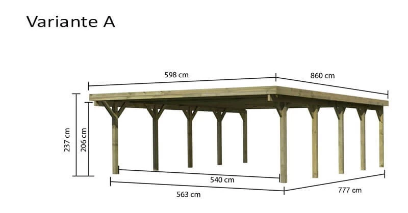 Das Doppelcarport Classic ĂĽberzeugt durch seine stabile Konstruktion. Das Flachdach besteht wahlweise aus 0,8mm starken PVC-Trapezplatten oder aus 0,5mm starken Stahldachplatten. Beide Dachvarianten werden mit einer Walmdachblende aus Massivholz geliefert, welche die unschönen Kanten der Dachplatten abdeckt. Getragen wir die Konstruktion durch 11,5×11,5 cm starke Pfosten inkl. Querverbindern aus kesseldruckimprägniertem Massivholz. Optional können Sie Ihr Carport durch ein oder zwei Einfahrtsbögen ergänzen und es so optisch aufwerten. Durch optional erhältliche H-Pfostenanker werden die Massivholzpfosten mit dem Boden sicher verbunden. Gestalten Sie Ihr Carport nach Ihren WĂĽnschen. Durch eine zusätzlich erhältliche Seiten- oder RĂĽckwand können Sie Ihre Autos abschirmen und so noch effektiver von der Seite vor Schlagregen schĂĽtzen. Benötigen Sie zusätzlichen Stauraum? Auch das ist mit dem Doppelcarport Classic kein Problem. Mit einem Geräteraum in zwei unterschiedlichen Modellen schaffen Sie in Ihrem Carport zusätzlichen Platz. Hier können Sie Ihre Gartengeräte, Fahrräder oder Ihre Gartenmöbel den Winter ĂĽber verstauen. Mit einem GesamtauĂźenmaĂź von 563 x 777,5 cm bietet das Doppelcarport Classic genĂĽgend Platz fĂĽr zwei Autos. Schaffen Sie einen geschĂĽtzten Ort fĂĽr Ihre PKWs mit dem Doppelcarport Classic.
