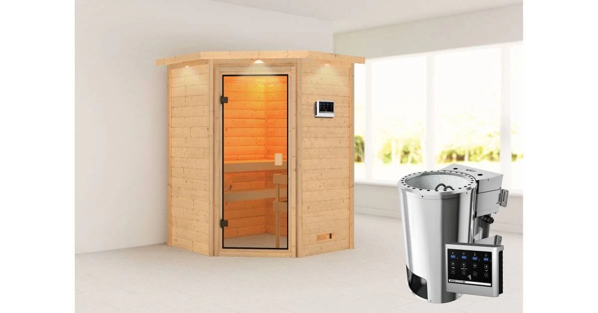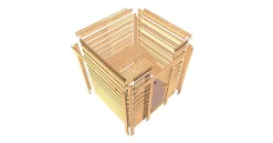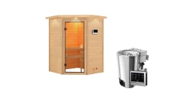 Karibu 38mm Massivholzsauna Antonia mit 3,6kW BIO Kombi-Ofen mit Dachkranz