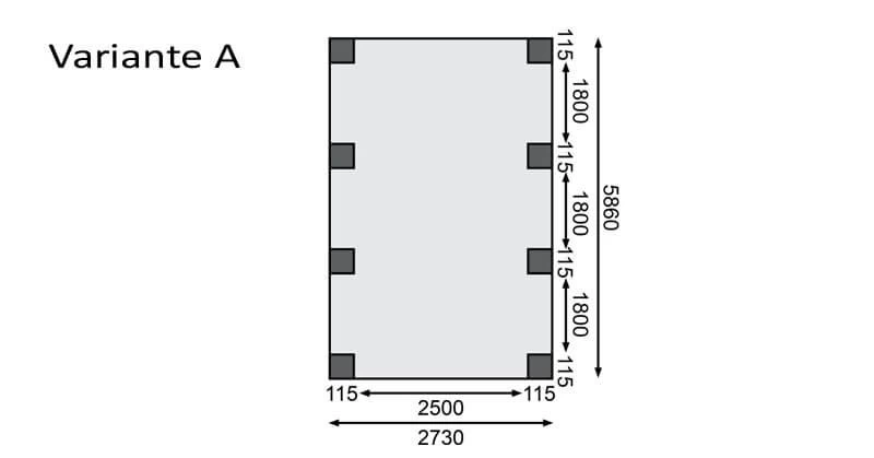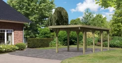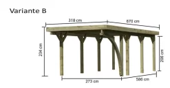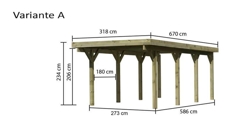 Eine stabile und sichere Lösung zum Unterstellen Ihres PKW bietet Ihnen das Einzelcarport Classic 2 . Das Dach des Carports besteht aus stabilen 0,8mm starken PVC-Trapezplatten oder einer 0,5mm starken Stahldachplatte. Mit einer Schneelast von 75 kg/m² ist diese allerdings nicht so hoch wie bei der Stahldachplatte. Hier liegt die Schneelast bei 125 kg/m². Mit diesen Eigenschaften der Dachvarianten ist bestimmt für jeden das Richtige dabei. Beide Dachvarianten werden mit einer Walmdachblende aus Massivholz geliefert, welche die unschönen Kanten der Platten verdeckt. Getragen wird die Konstruktion durch 11,5×11,5cm starke Pfosten mit Querverbindern aus kesseldruckimprägniertem Massivholz. Um das Carport ein wenig individueller zu gestalten, können Sie optional ein oder zwei Einfahrtsbögen an dem Carport montieren. Diese erleichtern das Einparken und werten das Einzelcarport optisch auf. Durch optional erhältliche H-Pfostenanker werden die Pfosten mit dem Boden sicher verankert. Mit einer Größe von 273 x 586 cm bietet das Carport ausreichend Platz. Bieten Sie Ihrem Auto im Sommer den Schutz vor direkten Sonnenstrahlen und im Winter vor Schnee und Regen mit dem Einzelcarport Classic 2 .