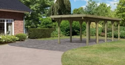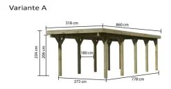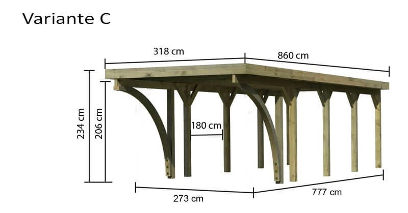 Eine stabile und sichere Lösung zum Unterstellen Ihres PKW bietet Ihnen das Einzelcarport Classic 3 . Das Dach des Carports besteht aus stabilen 0,8mm starken PVC-Trapezplatten oder einer 0,5mm starken Stahldachplatte. Mit einer Schneelast von 75 kg/m² ist diese allerdings nicht so hoch wie bei der Stahldachplatte. Hier liegt die Schneelast bei 125 kg/m². Mit diesen Eigenschaften der Dachvarianten ist bestimmt fĂĽr jeden das Richtige dabei. Beide Dachvarianten werden mit einer Walmdachblende aus Massivholz geliefert, welche die unschönen Kanten der Platten verdeckt. Getragen wird die Konstruktion durch 11,5×11,5cm starke Pfosten mit Querverbindern aus kesseldruckimprägniertem Massivholz. Um das Carport ein wenig individueller zu gestalten, können Sie optional ein oder zwei Einfahrtsbögen an dem Carport montieren. Diese erleichtern das Einparken und werten das Einzelcarport optisch auf. Durch optional erhältliche H-Pfostenanker werden die Pfosten mit dem Boden sicher verankert. Mit einer Größe von 273 x 777,5 cm bietet das Carport ausreichend Platz. Bieten Sie Ihrem Auto im Sommer den Schutz vor direkten Sonnenstrahlen und im Winter vor Schnee und Regen mit dem Einzelcarport Classic 3 .