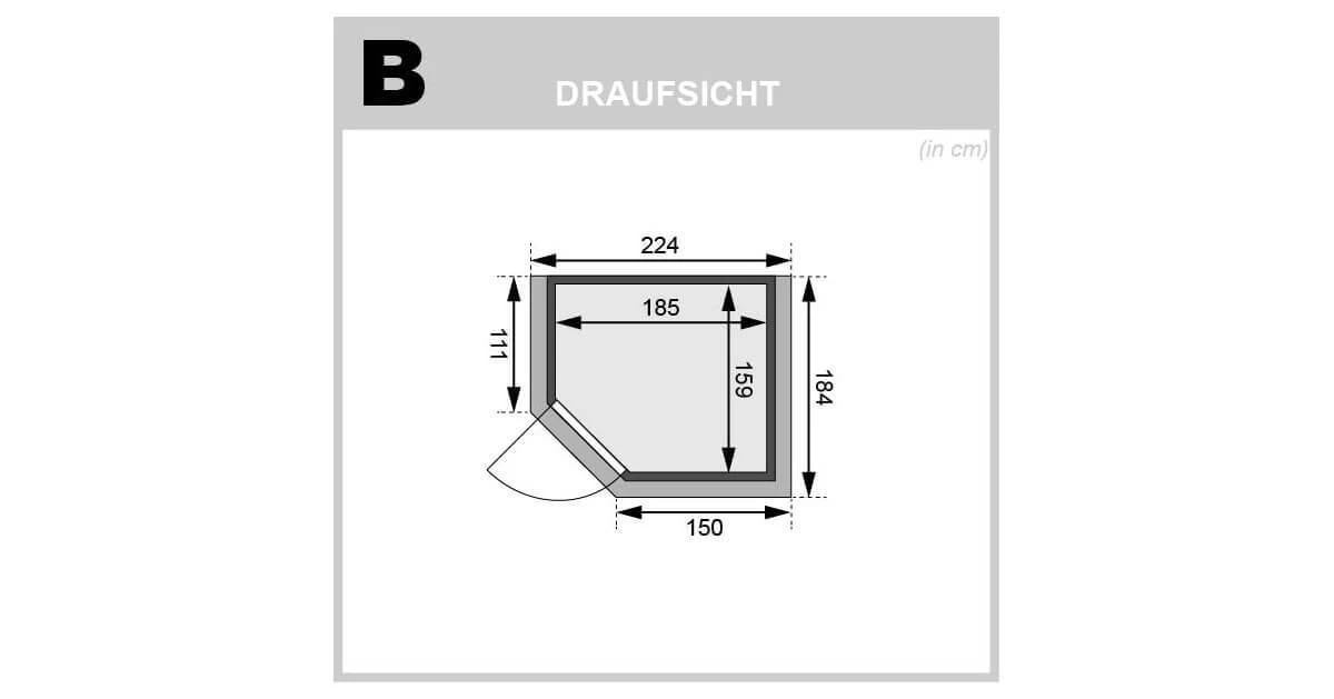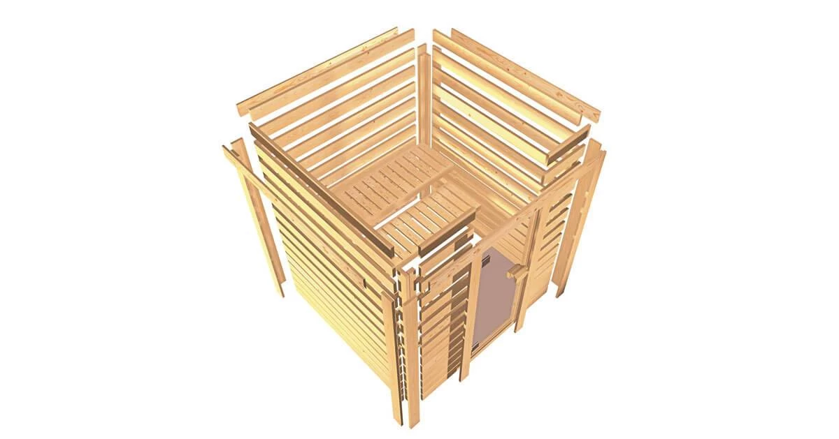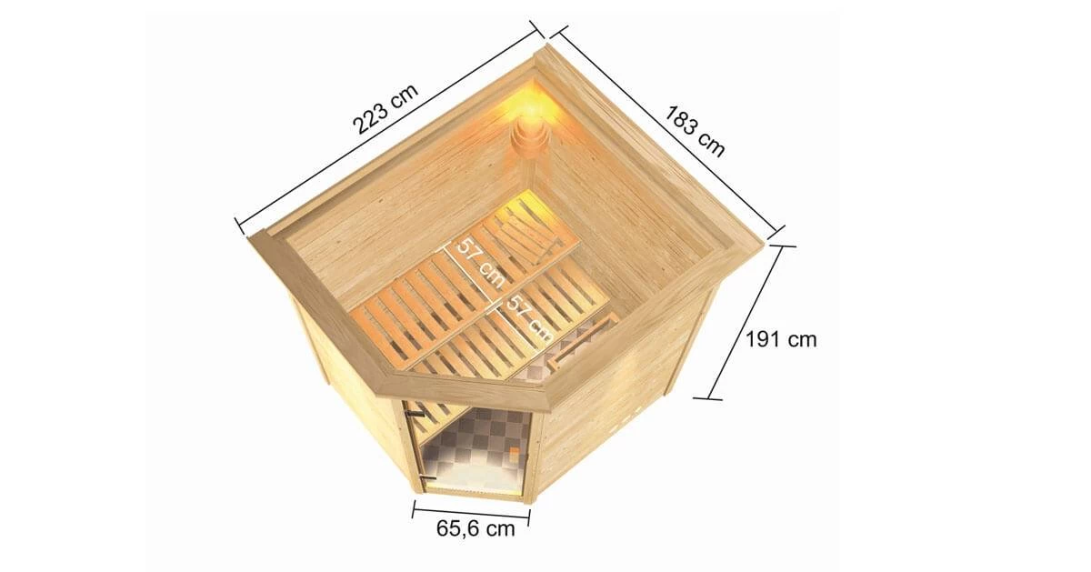 Diese Massivholzsauna aus 38 mm starken Massivholzbrettern aus hochwertiger nordischer Fichte wird im einfachen Steck-/Schraubsystem errichtet. Durch die hochwertige Saunatür mit Eckeinstieg gelangen Sie nach erfolgter Montage in den Innenraum mit 185 cm x 159 cm. Außenmaß: ca. 223 x 183 cm. Hier empfangen Sie das mitgelieferte Ofenschutzgitter sowie 2 Liege/n. Auch bei unseren Massivholzsaunen im Steck-/Schraubsystem sind alle 4 Seitenwände aus massivem Fichtenholz erstellt, sodass wir hier keinen Einsatz von Hartfaserplatten oder ähnlichem haben (außer im Dachbereich). Die Sauna mit den 4 Sichtseiten können so beliebig im Raum platziert werden. Die Dachplatten bestehen aus 57 mm Elementbauweise mit einer Mineralwolldämmung.
