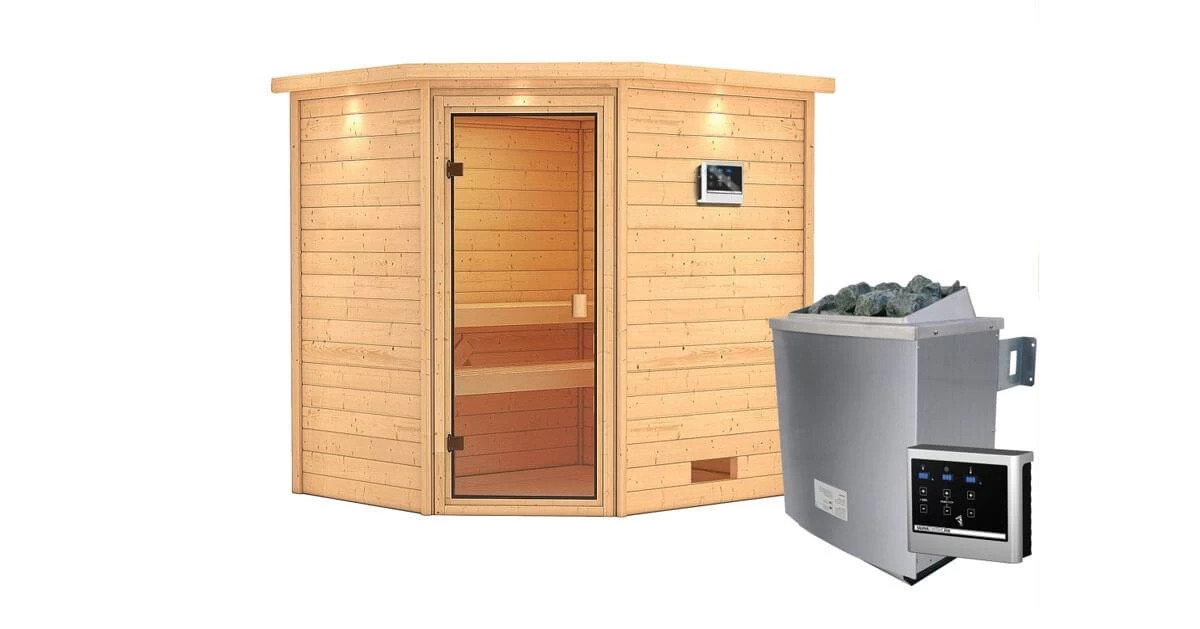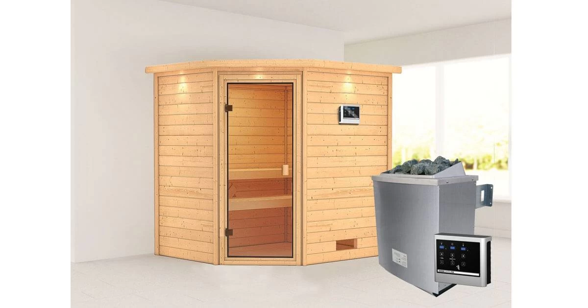 Karibu 38mm Massivholzsauna Elea + 9kW Saunaofen mit externer Steuerung Easy