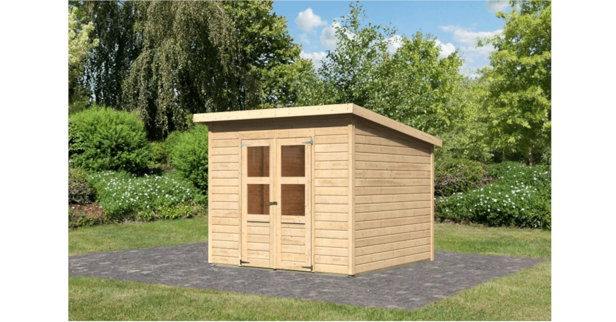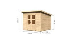 Das Gartenhaus mit optionalem Anbau. Ein Gartenhaus zum Verstauen der Gartengeräte und ein schützendes Dach für das Spielzeug Ihrer Kleinen oder als Unterstand für Fahrräder. Diese und noch viele weitere Möglichkeiten bietet das Gartenhaus Merseburg 6. Durch sein naturbelassenes Holz kann es durch einen farblich individuellen Anstrich auf Ihr Gartenambiente abgestimmt werden. Das Gartenhaus Merseburg setzt Ihnen hier keine Grenzen. Der Innenraum mit den Maßen (BxT) 235 x 237 cm, bietet ausreichend Platz für Ihre Gegenstände. Das Haus wird von unten mit kesseldruckimprägnierten Bodenbalken geschützt. Von oben bietet das Pultdach Schutz vor der Witterung. Die Doppelflügeltür mit zwei Lichtausschnitten je Türflügel und einer Sicherheitsüberfalle lässt viel Tageslicht in das Innere und bietet so eine natürliche Lichtquelle. Reicht Ihnen der Platz im Inneren nicht aus können Sie das Gartenhaus Merseburg 6mit einem optional erhältlichen Anbaudach erweitern. Das Anbaudach hat eine Breite von 166 cm und eignet sich ideal als Unterstellmöglichkeit für größere Gegenstände. Mit einer optional erhältlichen Rückwand bieten Sie Ihren Gegenständen noch mehr Schutz vor der Witterung. Das Gartenhaus Merseburg 6 – ein Gartenhaus mit optionalem Anbau.