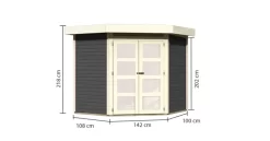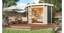 Unser Flachdach mit interessantem Grundriss. Ein Fünfeckhaus, welches das Ambiente Ihres Gartens abrundet? Ein echter Hingucker in einem sonst schlichten Umfeld? Das ist mit dem Gartenhaus Goldendorf 3 möglich. Gestalten Sie sich in Ihrem Garten Ihren eigenen Rückzugsort. Entspannen Sie in dem 209 x cm großen Innenraum mit einem Buch oder genießen Sie die ersten Sonnenstrahlen unter dem optional erhältlichen Vordach. Das Gartenhaus Goldendorf ist in naturbelassen und in terragrau erhältlich. Gestalten Sie das naturbelassene Holz ganz nach Ihren Vorstellungen. Streichen Sie es in Ihrer Lieblingsfarbe an oder behalten Sie die natürliche Farbe des Holzes mit einer Holzschutzlasur bei. Das moderne terragrau, mit Akzenten in elfenbeinweiß, schafft das gewisse Etwas in Ihrem Garten. Durch den integrierten Holzschutz erleichtern Sie sich die Arbeit und können direkt mit dem Aufbau beginnen. So ist für jeden garantiert das Richtige dabei. Das Innere des Gartenhauses erreichen Sie durch eine Doppelflügeltür mit vier Lichtausschnitten in Milchglasoptik, welche durch eine Sicherheitsüberfalle gleichzeitig vor unbefugtem Betreten schützt. Auch der Platz im Inneren kann frei nach den eigenen Wünschen eingerichtet werden. Egal ob mit einem gemütlichen Sofa oder einer Werkbank. Das Gartenhaus Goldendorf 3 passt sich den Vorstellungen an. Nutzen Sie die Ecke Ihres Gartens mit dem Fünfeckhaus Goldendorf 3.