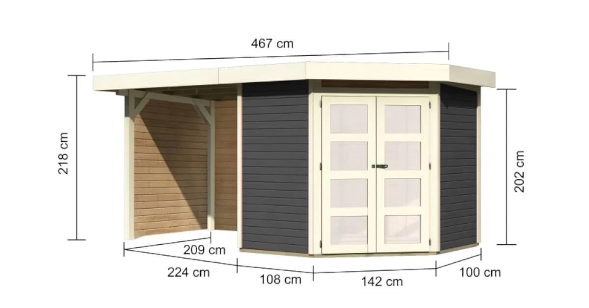 Unser Flachdach mit interessantem Grundriss. Ein Fünfeckhaus, welches das Ambiente Ihres Gartens abrundet? Ein echter Hingucker in einem sonst schlichten Umfeld? Das ist mit dem Gartenhaus Goldendorf 3 möglich. Gestalten Sie sich in Ihrem Garten Ihren eigenen Rückzugsort. Entspannen Sie in dem 209 x cm großen Innenraum mit einem Buch oder genießen Sie die ersten Sonnenstrahlen unter dem optional erhältlichen Vordach. Das Gartenhaus Goldendorf ist in naturbelassen und in terragrau erhältlich. Gestalten Sie das naturbelassene Holz ganz nach Ihren Vorstellungen. Streichen Sie es in Ihrer Lieblingsfarbe an oder behalten Sie die natürliche Farbe des Holzes mit einer Holzschutzlasur bei. Das moderne terragrau, mit Akzenten in elfenbeinweiß, schafft das gewisse Etwas in Ihrem Garten. Durch den integrierten Holzschutz erleichtern Sie sich die Arbeit und können direkt mit dem Aufbau beginnen. So ist für jeden garantiert das Richtige dabei. Das Innere des Gartenhauses erreichen Sie durch eine Doppelflügeltür mit vier Lichtausschnitten in Milchglasoptik, welche durch eine Sicherheitsüberfalle gleichzeitig vor unbefugtem Betreten schützt. Auch der Platz im Inneren kann frei nach den eigenen Wünschen eingerichtet werden. Egal ob mit einem gemütlichen Sofa oder einer Werkbank. Das Gartenhaus Goldendorf 3 passt sich den Vorstellungen an. Nutzen Sie die Ecke Ihres Gartens mit dem Fünfeckhaus Goldendorf 3.