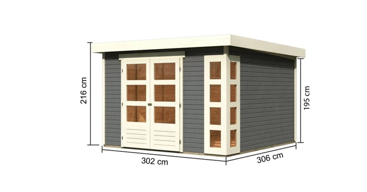 Die moderne Fensterecke mit 8 feststehenden Lichtausschnitten sorgt für viel Tageslicht im Innenraum und lässt ihn strahlen. Ob als Werkstatt, Fitnessraum oder für Ihre Gartengeräte. Das Gartenhaus Kerko mit einem Außenmaß von (BxT) 302x306cm bietet Ihnen viele Anwendungsmöglichkeiten.