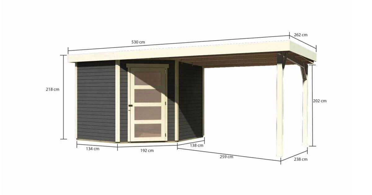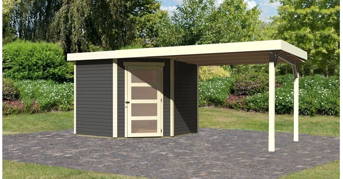 Karibu Gartenhaus 19mm Wandstärke Schwandorf 5 mit Anbau 2,80m Terragrau