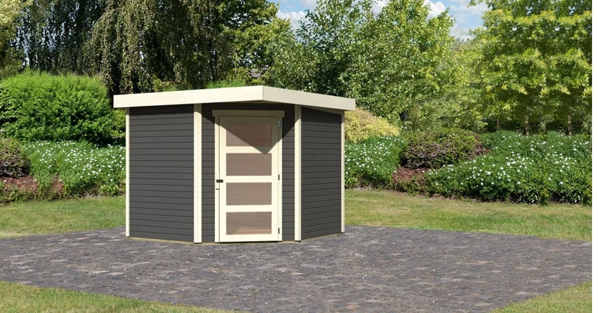 Nutzen Sie die Ecke Ihres Gartens sinnvoll mit dem Gartenhaus Schwandorf 5. Die moderne Ecktür mit vier Lichtausschnitten in Milchglasoptik sorgt für einen echten Hingucker in Ihrem Garten. Ob modern oder klassisch, das Gartenhaus Schwandorf passt bestimmt in jedes Ambiente. Wählen Sie die Farbe terragrau oder gestalten Sie das naturbelassene Gartenhaus nach Ihren eigenen Farbvorstellungen. Mit einem Außenmaß von (BxT) 242x246cm hat das Gartenhaus die optimale Größe für viele Gestaltungsmöglichkeiten. Nutzen Sie es zum Beispiel als Unterstand für Ihre Gartengeräte oder als kleines Gärtnerhaus. Durch ein Anbaudach kann auch der Platz vor dem Gartenhaus sinnvoll ausgenutzt werden. Das Schleppdach ist in der Breite 2,40m oder 2,80m erhältlich. Die optionale Seiten- und Rückwand schützt die Gegenstände unter dem Schleppdach zusätzlich vor Regen und Wind. So muss der Grillabend auch bei einem Wetterumschwung nicht unterbrochen werden. Von unten wird das Gartenhaus durch kesseldruckimprägnierte Bodenbalken vor Feuchtigkeit geschützt. Nutzen Sie den neu gewonnen Platz als gemütlichen Rückzugsort zur Entspannung oder vielleicht doch als Bastelwerkstatt mit überdachtem Außenbereich? Das Gartenhaus Schwandorf 5 richtet sich ganz nach Ihren Wünschen.