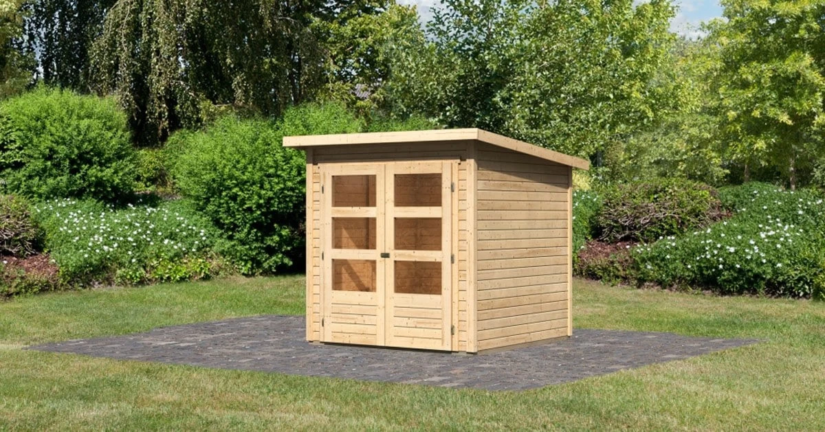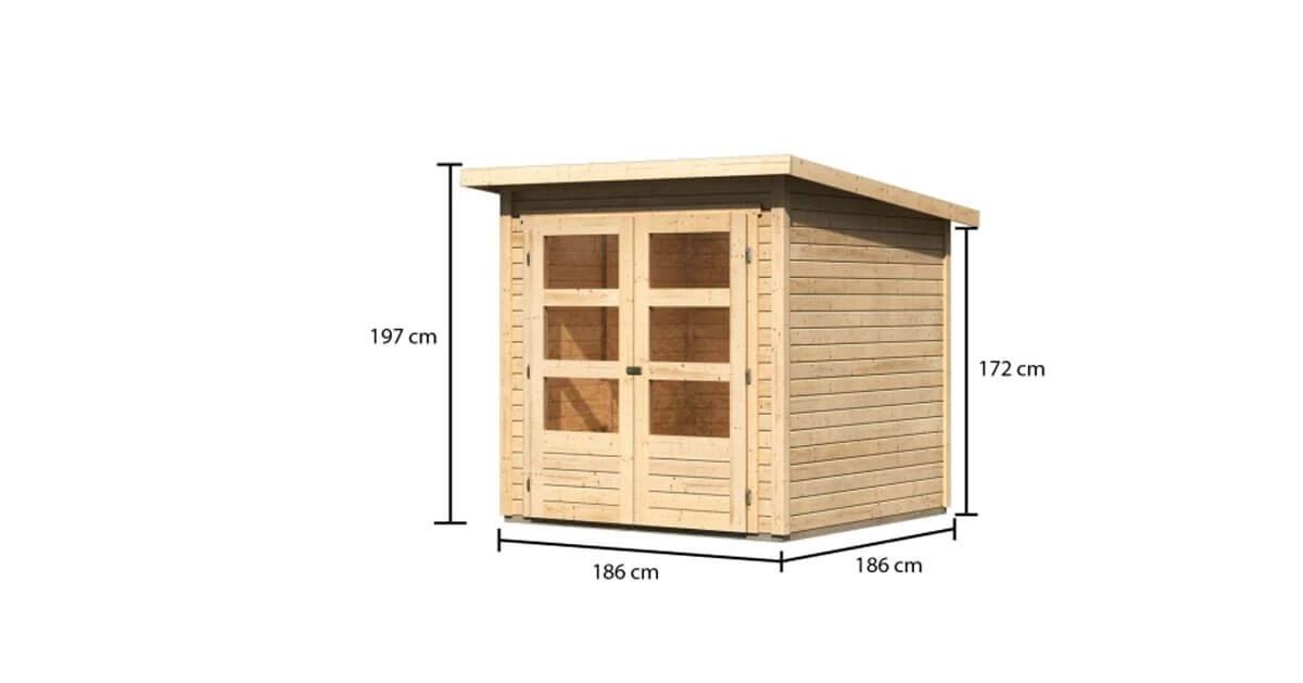 Das Gartenhaus Stockach 2 ist der Hingucker in Ihrem Garten. Das 19mm Haus überzeugt durch sein modernes Pultdach mit einer Dachfläche von 4,3m² und den unkomplizierten Look. Dadurch hat es kein Problem sich in seine Umgebung einzufügen und passt bestimmt auch in Ihr Gartenambiente. Das Gartenhaus besteht aus nordischem Fichtenholz und wird mithilfe eines Steck- und Schraubsystems aufgebaut. Dies ermöglicht eine einfache und schnelle Montage ohne großes handwerkliches Geschick. Das Haus ist in modernem terragrau und in naturbelassen zur eigenen Gestaltung erhältlich. So bleibt es bei Ihnen wie Sie Ihr Gartenhaus Stockach gestalten und einrichten. In das Innere des Gartenhauses gelangen Sie durch eine Doppelflügeltür mit drei Lichtausschnitten pro Türflügel. Gesichert wird das Haus mit eine Sicherheitsüberfalle. Durch die Lichtausschnitte gelangt viel Tageslicht ins Innere und lässt das Haus somit nicht nur von außen strahlen. Mit einem Außenmaß von (BxT) 186x186cm bietet es viel Platz für Ihre Gartenmöbel oder Gartengeräte. Das Gartenhaus wird durch kesseldruckimprägnierte Bodenbalken vor aufsteigender Feuchtigkeit geschützt. Ob als Rückzugsort im eigenen Garten oder als Unterstellmöglichkeit für Gartengerät, dass Gartenhaus Stockach 2 bietet Ihnen viele Möglichkeiten.