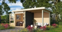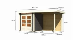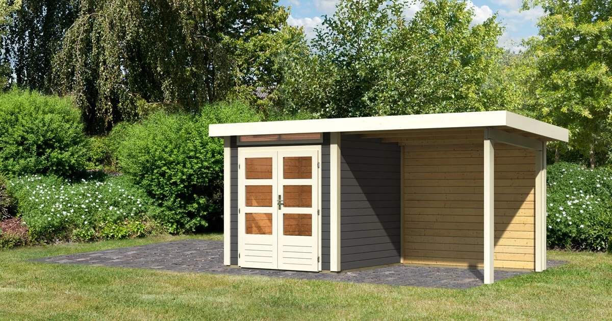 Karibu Gartenhaus 28mm Wandstärke Kandern 1 mit Anbau 2,35m Terragrau + Rückwand