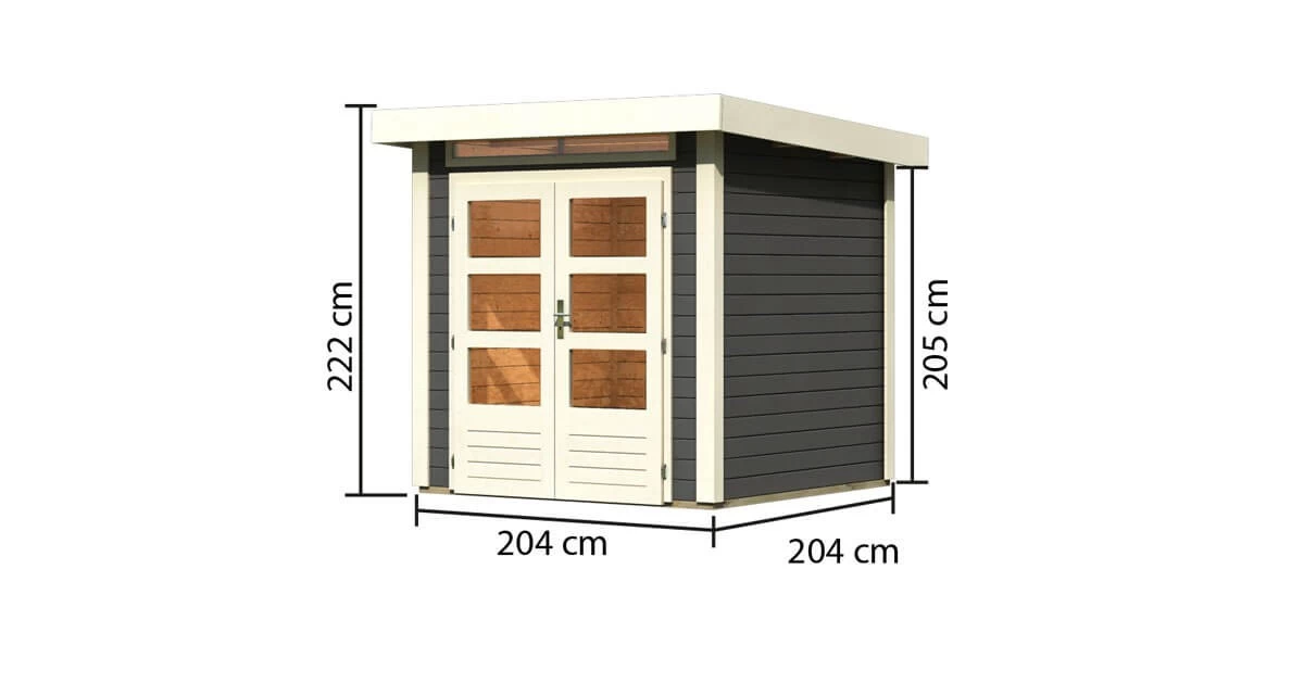 Das Gartenhaus Kandern 1, ein attraktives Pultdach in zwei Farben. Das 28mm Pultdachhaus aus nordischem Fichtenholz mit Steck-/Schraubsystem ist sowohl in terragrau, als auch in naturbelassen erhältlich. Eine groĂźe Besonderheit ist das feststehende Oberlichtfenster mit den MaĂźen (BxH) 157,5×18,5cm. Durch dieses und durch die Lichtausschnitte in der TĂĽr fällt viel Tageslicht in den Innenraum und sorgt fĂĽr eine natĂĽrliche Lichtquelle. So eignet sich das Haus nicht nur als Unterstellmöglichkeit, sondern auch als gemĂĽtlicher, geschĂĽtzter Raum im eigenen Garten. Im AuĂźenbereich lässt sich das Gartenhaus Kandern durch ein optionales Anbaudach erweitern und bietet somit noch mehr Platz fĂĽr mehr Gestaltungsideen. So können Sie Ihre Gartengeräte, Möbel oder ähnliches schnell und einfach vor der Witterung schĂĽtzen und haben noch länger Freude an ihnen. Auch das Haus ĂĽberzeugt dank der 28mm starken Wandbohlen mit seiner Langlebigkeit. Die DoppelflĂĽgeltĂĽr mit drei Lichtausschnitten je TĂĽrflĂĽgel und Buntbartschloss schĂĽtzt das Gartenhaus vor unbefugtem Eindringen. Das Dach des Gartenhauses mit einer Dachfläche von 5,3m² können Sie effektiv mit unserer optional erhältlichen selbstklebenden Dachfolie vor WitterungseinflĂĽsse schĂĽtzen. Ihre Gegenstände im Hausinneren werden von unten durch einen optional erhältlichen FuĂźboden und durch im Lieferumfang enthaltene kesseldruckimprägnierte Bodenbalken geschĂĽtzt. Gestalten Sie Ihren Garten stilvoll mit dem attraktiven Pultdachhaus Kandern 1.