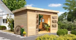 Das Gartenhaus Kandern 7, ein attraktives Pultdach in zwei Farben. Das 28mm Pultdachhaus aus nordischem Fichtenholz mit Steck-/Schraubsystem ist sowohl in terragrau, als auch in naturbelassen erhältlich. Eine groĂźe Besonderheit ist das feststehende Oberlichtfenster mit den MaĂźen (BxH) 289,5×18,6cm. Durch dieses und durch die Lichtausschnitte in der TĂĽr fällt viel Tageslicht in den Innenraum und sorgt fĂĽr eine natĂĽrliche Lichtquelle. So eignet sich das Haus nicht nur als Unterstellmöglichkeit, sondern auch als gemĂĽtlicher, geschĂĽtzter Raum im eigenen Garten. Im AuĂźenbereich lässt sich das Gartenhaus Kandern durch ein optionales Anbaudach erweitern und bietet somit noch mehr Platz fĂĽr mehr Gestaltungsideen. So können Sie Ihre Gartengeräte, Möbel oder ähnliches schnell und einfach vor der Witterung schĂĽtzen und haben noch länger Freude an ihnen. Auch das Haus ĂĽberzeugt dank der 28mm starken Wandbohlen mit seiner Langlebigkeit. Die DoppelflĂĽgeltĂĽr mit drei Lichtausschnitten je TĂĽrflĂĽgel und Buntbartschloss schĂĽtzt das Gartenhaus vor unbefugtem Eindringen. Das Dach des Gartenhauses mit einer Dachfläche von 10,5m² können Sie effektiv mit unserer optional erhältlichen selbstklebenden Dachfolie vor WitterungseinflĂĽsse schĂĽtzen. Ihre Gegenstände im Hausinneren werden von unten durch einen optional erhältlichen FuĂźboden und durch im Lieferumfang enthaltene kesseldruckimprägnierte Bodenbalken geschĂĽtzt. Gestalten Sie Ihren Garten stilvoll mit dem attraktiven Pultdachhaus Kandern 7.