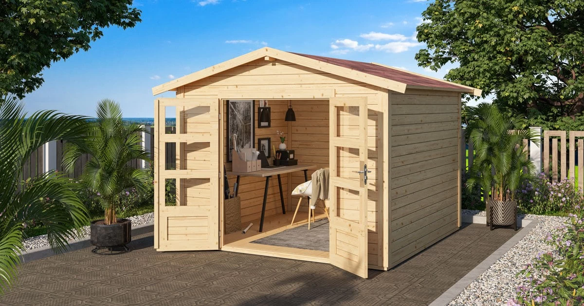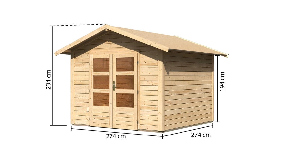 28mm Steck-/Schraubsystem, Satteldach, aus nordischer Fichte. So lässt sich das Gartenhaus Talkau 6 schnell und zutreffend beschreiben. Das Haus ist in der Farbe terragrau und in naturbelassen erhältlich. So erhalten Sie die Möglichkeit Ihr Gartenhaus auf Ihr Gartenambiente perfekt anzupassen. Egal ob klassisches Streichen oder direktes Benutzen, das Gartenhaus Talkau ist für jeden Geschmack geeignet. Das Satteldach mit einer Dachfläche von 11,3m² rundet das Gesamtbild ab. Mit Außenmaßen von (BxT) 274x274cm bietet das Haus Ihnen viel Nutzfläche. Ob als Geräteraum oder doch für Sportgeräte? Diese Entscheidung bleibt ganz Ihnen überlassen. Die großzügige Doppelflügeltür mit drei Lichtausschnitten sorgt für einen hellen Innenraum, welcher durch ein Buntbartschloss inkl. zwei Schlüsseln effektiv vor unbefugtes Eindringen geschützt wird. Lassen Sie Ihrer Kreativität freien Lauf und gestalten Sie Ihr Gartenhaus ganz nach Ihren Bedürfnissen mit dem passenden Zubehör. Ein Anbauschrank für kleine Gartengeräte, ein Schleppdach für Kaminholz oder ein Fußboden. Das Gartenhaus lässt sich beliebig einrichten und erweitern. Der Dachüberstand in der Front von 17cm sowie in den Seiten von 15cm und hinten von 17cm bietet den Wänden Schutz vor direktem Niederschlag. Von unten schützen kesseldruckimprägnierte Bodenbalken das Haus vor aufsteigender Nässe. Das Gartenhaus Talkau 6 ist ein echter Allrounder für Ihren Garten.
