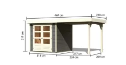 Egal ob modern, klassisch oder elegant, das Gartenhaus Askola passt in jedes Gartenambiente. Mit einem Außenmaß von (BxT) 213x217cm hat es die ideale Größe zum Verstauen von Gartengeräten oder zum Gestalten eines gemütlichen Rückzugsortes im eigenen Garten. Das Haus ist ebenfalls mit einem Anbaudach in den Breiten 2,40m oder 2,80m erhältlich. Dieses dient optimal als Unterstand für Gartengeräte oder für eine bequeme Sitzgruppe für Grillabende. Geschütztes Grillen an einem verregneten Sommertag steht nun nichts mehr im Wege.