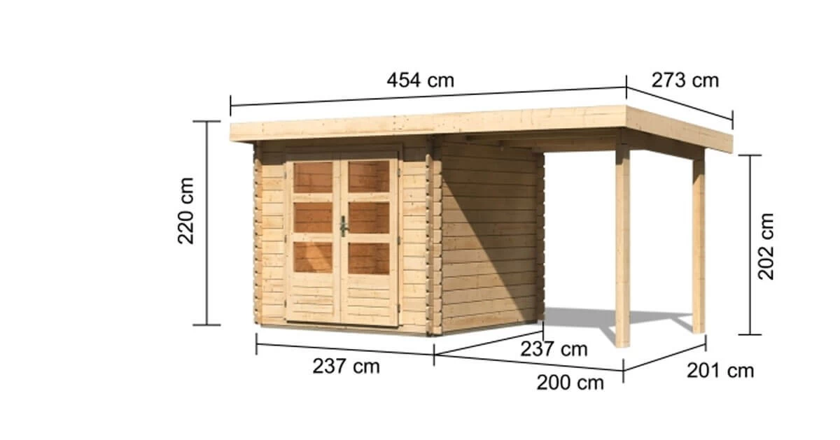 Das moderne Blockbohlenhaus mit Pultdach. Das Bastrup 2 mit 28 mm starken Bohlen besteht aus nordischem Fichtenholz. Ein großer Vorteil dieser Serie ist die patentierte 6-Plus-Eckverbindung. Zusammen sorgt dies nicht nur für eine langlebige, stabile Konstruktion, sondern auch für ein robustes Gesamtbild. Das macht das Gartenhaus Bastrup mit einem Außenmaß von (BxT) 237x237cm zu einem langen, treuen und festen Begleiter im eigenen Garten. Einmal aufgebaut und eingerichtet ist das Haus nicht mehr wegzudenken. In das Innere gelangen Sie durch eine großzügige Doppelflügeltür mit drei Lichtausschnitten je Türflügel. Gesichert wird das Haus mithilfe eines Buntbartschlosses in der Tür. Durch die Lichtausschnitte gelangt Tageslicht in den Innenbereich und lässt das Haus somit nicht nur von außen strahlen. Das Gartenhaus ist in naturbelassen erhältlich und kann durch ein optional erhältliches Anbaudach in der Breite 2m oder 3m im Außenbereich erweitert werden. Dies lässt viel Platz für Ihre Gestaltungsideen. Verstauen Sie zum Beispiel Ihre Gartengeräte im Inneren des Häuschens, um Ihren Garten nach getaner Arbeit ordentlich zu hinterlassen oder nutzen Sie den Innenbereich zur Lagerung Ihrer Gartenmöbel im Winter. Der zusätzliche Platz unter dem Anbaudach kann im Sommer als Schutz vor der Witterung für eine gemütliche Sitzgruppe dienen. Bereichern Sie Ihren Garten mit dem modernen Blockbohlenhaus Bastrup 2.