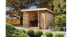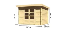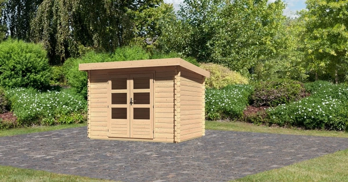 Das moderne Blockbohlenhaus mit Pultdach. Das Bastrup 3 mit 28 mm starken Bohlen besteht aus nordischem Fichtenholz. Ein großer Vorteil dieser Serie ist die patentierte 6-Plus-Eckverbindung. Zusammen sorgt dies nicht nur für eine langlebige, stabile Konstruktion, sondern auch für ein robustes Gesamtbild. Das macht das Gartenhaus Bastrup mit einem Außenmaß von (BxT) 297x237cm zu einem langen, treuen und festen Begleiter im eigenen Garten. Einmal aufgebaut und eingerichtet ist das Haus nicht mehr wegzudenken. In das Innere gelangen Sie durch eine großzügige Doppelflügeltür mit drei Lichtausschnitten je Türflügel. Gesichert wird das Haus mithilfe eines Buntbartschlosses in der Tür. Durch die Lichtausschnitte gelangt Tageslicht in den Innenbereich und lässt das Haus somit nicht nur von außen strahlen. Das Gartenhaus ist in naturbelassen erhältlich und kann durch ein optional erhältliches Anbaudach in der Breite 2m oder 3m im Außenbereich erweitert werden. Dies lässt viel Platz für Ihre Gestaltungsideen. Verstauen Sie zum Beispiel Ihre Gartengeräte im Inneren des Häuschens, um Ihren Garten nach getaner Arbeit ordentlich zu hinterlassen oder nutzen Sie den Innenbereich zur Lagerung Ihrer Gartenmöbel im Winter. Der zusätzliche Platz unter dem Anbaudach kann im Sommer als Schutz vor der Witterung für eine gemütliche Sitzgruppe dienen. Bereichern Sie Ihren Garten mit dem modernen Blockbohlenhaus Bastrup 3.