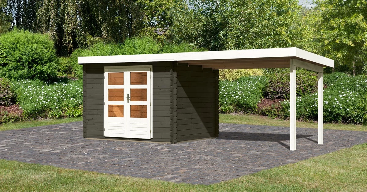 Karibu 28mm Blockbohlenhaus Bastrup 3 mit 3m Anbau terragrau