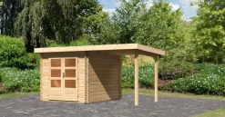 Das moderne Blockbohlenhaus mit Pultdach. Das Bastrup 4 mit 28 mm starken Bohlen besteht aus nordischem Fichtenholz. Ein großer Vorteil dieser Serie ist die patentierte 6-Plus-Eckverbindung. Zusammen sorgt dies nicht nur für eine langlebige, stabile Konstruktion, sondern auch für ein robustes Gesamtbild. Das macht das Gartenhaus Bastrup mit einem Außenmaß von (BxT) 237x297cm zu einem langen, treuen und festen Begleiter im eigenen Garten. Einmal aufgebaut und eingerichtet ist das Haus nicht mehr wegzudenken. Das Gartenhaus ist in naturbelassen erhältlich und kann durch ein optional erhältliches Anbaudach in der Breite 2m, 3m oder 4m im Außenbereich erweitert werden. Dies lässt viel Platz für Ihre Gestaltungsideen. Verstauen Sie zum Beispiel Ihre Gartengeräte im Inneren des Häuschens, um Ihren Garten nach getaner Arbeit ordentlich zu hinterlassen oder nutzen Sie den Innenbereich zur Lagerung Ihrer Gartenmöbel im Winter. Der zusätzliche Platz unter dem Anbaudach kann im Sommer als Schutz vor der Witterung für eine gemütliche Sitzgruppe dienen. Wer möchte nicht gerne an einem verregneten Sommertag oder einem lauen Winterabend lieber die Zeit im eigenen Garten verbringen und der Natur lauschen. Mit dem robusten Gartenhaus Bastrup gehören diese Träume der Vergangenheit an. Der großzügige Innenraum mit den Maßen (BxT) 214x274cm bietet ausreichend Platz für eine individuelle Einrichtung nach dem eigenen Geschmack. Bereichern Sie Ihren Garten mit dem modernen Blockbohlenhaus Bastrup 4.