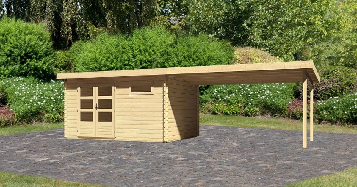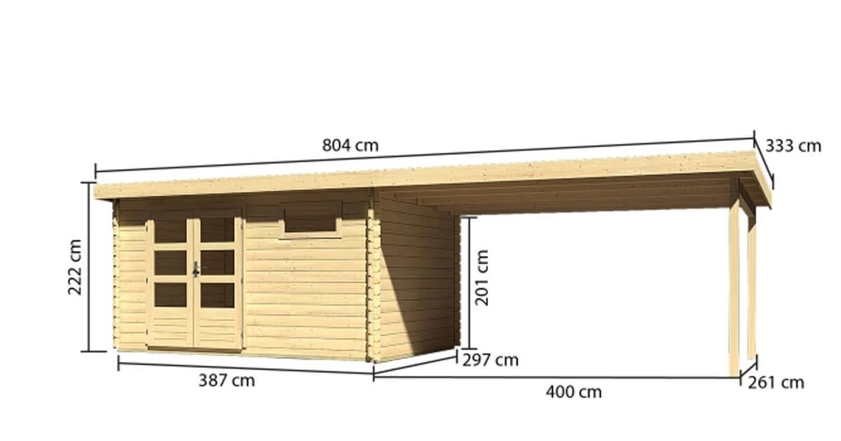 Das moderne Blockbohlenhaus mit Pultdach. Das Bastrup 8 mit 28 mm starken Bohlen besteht aus nordischem Fichtenholz. Ein großer Vorteil dieser Serie ist die patentierte 6-Plus-Eckverbindung. Zusammen sorgt dies nicht nur für eine langlebige, stabile Konstruktion, sondern auch für ein robustes Gesamtbild. Das macht das Gartenhaus Bastrup mit einem Außenmaß von (BxT) 387x297cm zu einem langen, treuen und festen Begleiter im eigenen Garten. Einmal aufgebaut und eingerichtet ist das Haus nicht mehr wegzudenken. Das Gartenhaus ist in naturbelassen erhältlich und kann durch ein optional erhältliches Anbaudach in der Breite 2m, 3m oder 4m im Außenbereich erweitert werden. Dies lässt viel Platz für Ihre Gestaltungsideen. Verstauen Sie zum Beispiel Ihre Gartengeräte im Inneren des Häuschens, um Ihren Garten nach getaner Arbeit ordentlich zu hinterlassen oder nutzen Sie den Innenbereich zur Lagerung Ihrer Gartenmöbel im Winter. Der zusätzliche Platz unter dem Anbaudach kann im Sommer als Schutz vor der Witterung für eine gemütliche Sitzgruppe dienen. Wer möchte nicht gerne an einem verregneten Sommertag oder einem lauen Winterabend lieber die Zeit im eigenen Garten verbringen und der Natur lauschen. Mit dem robusten Gartenhaus Bastrup gehören diese Träume der Vergangenheit an. Der großzügige Innenraum mit den Maßen (BxT) 364x274cm bietet ausreichend Platz für eine individuelle Einrichtung nach dem eigenen Geschmack. Bereichern Sie Ihren Garten mit dem modernen Blockbohlenhaus Bastrup 8.