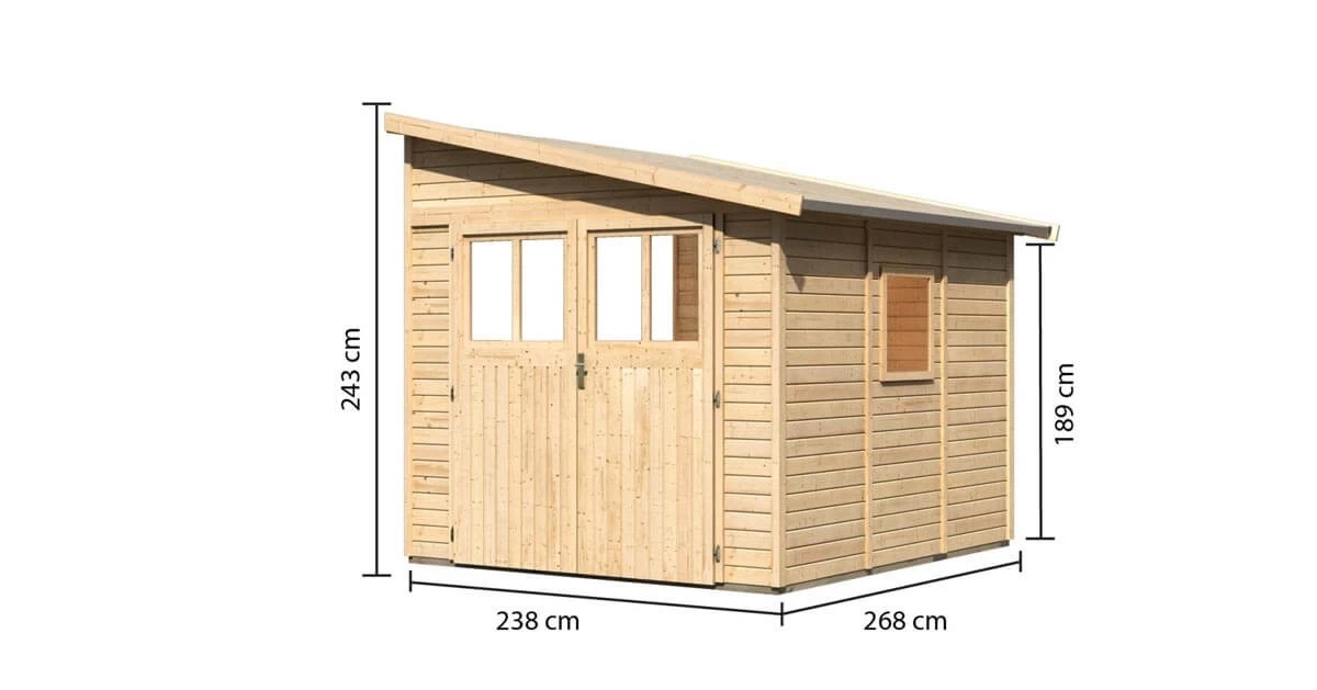 Die breite Alternative zum Wandlitz. Mit einer Außenmaßbreite von 238 cm haben Sie viel Platz zum Unterstellen von Ihren Gartengeräten. Das Gartenhaus Bomlitz ist in drei verschiedenen Größen erhältlich und passt bestimmt auch zu Ihren Vorstellungen. Das Gartenhaus wird mit einer Doppelflügeltür inklusive einem Lichtausschnitt pro Türflügel und einem Buntbartschloss vor unbefugtem Betreten gesichert. Schutz vor Nässe bietet von oben ein Pultdachhaus, welches durch unsere Dachschindeln effektiv geschützt werden kann. Von unten schützen kesseldruckimprägnierte Bodenbalken das Haus vor aufsteigender Nässe. Die Konstruktion aus 19 mm starken Brettern aus nordischem Fichtenholz kann durch die Wandelemente einfach und schnell montiert werden. Das Gartenhaus Bomlitz 3 ist in Naturbelassen und Terragrau erhältlich und lässt in der äußeren Gestaltung viel Spielraum. Streichen Sie das Holz in Ihren Lieblingsfarben und passen Sie es zum Beispiel optisch Ihrer Hauswand an. Durch einen Fußboden runden Sie das Gesamtbild ab. Eine optional erhältliche Doppelflügeltür, welche in die Rückseite eingebaut werden kann, ermöglicht ein Betreten des Hauses von beiden Seiten. So kann die Seite zum Garten zum Lagern der Gartengeräte genutzt werden und die Seite nach vorne kann als Unterstand für Ihre Fahrräder dienen. Der doppelte Zugang macht Ihre Gegenstände immer griffbereit. Die breitere Alternative zum klassischen Gartenhaus das Gartenhaus Bomlitz 3.